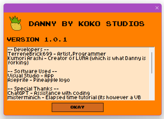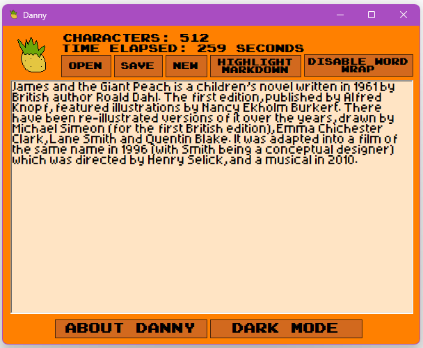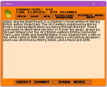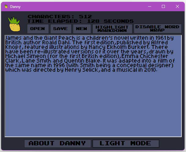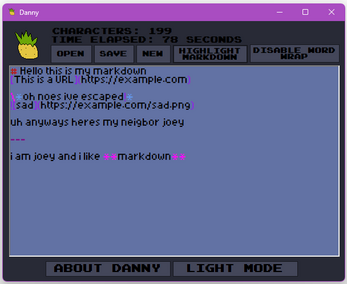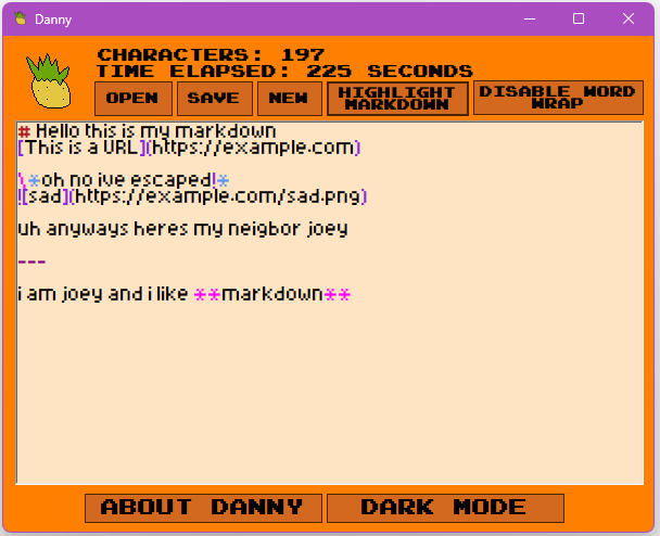 Danny (Short for Danny is not an acronym) is a rudimentary text editor that features markdown syntax, word wrapping, time elapsed, and pineapple.